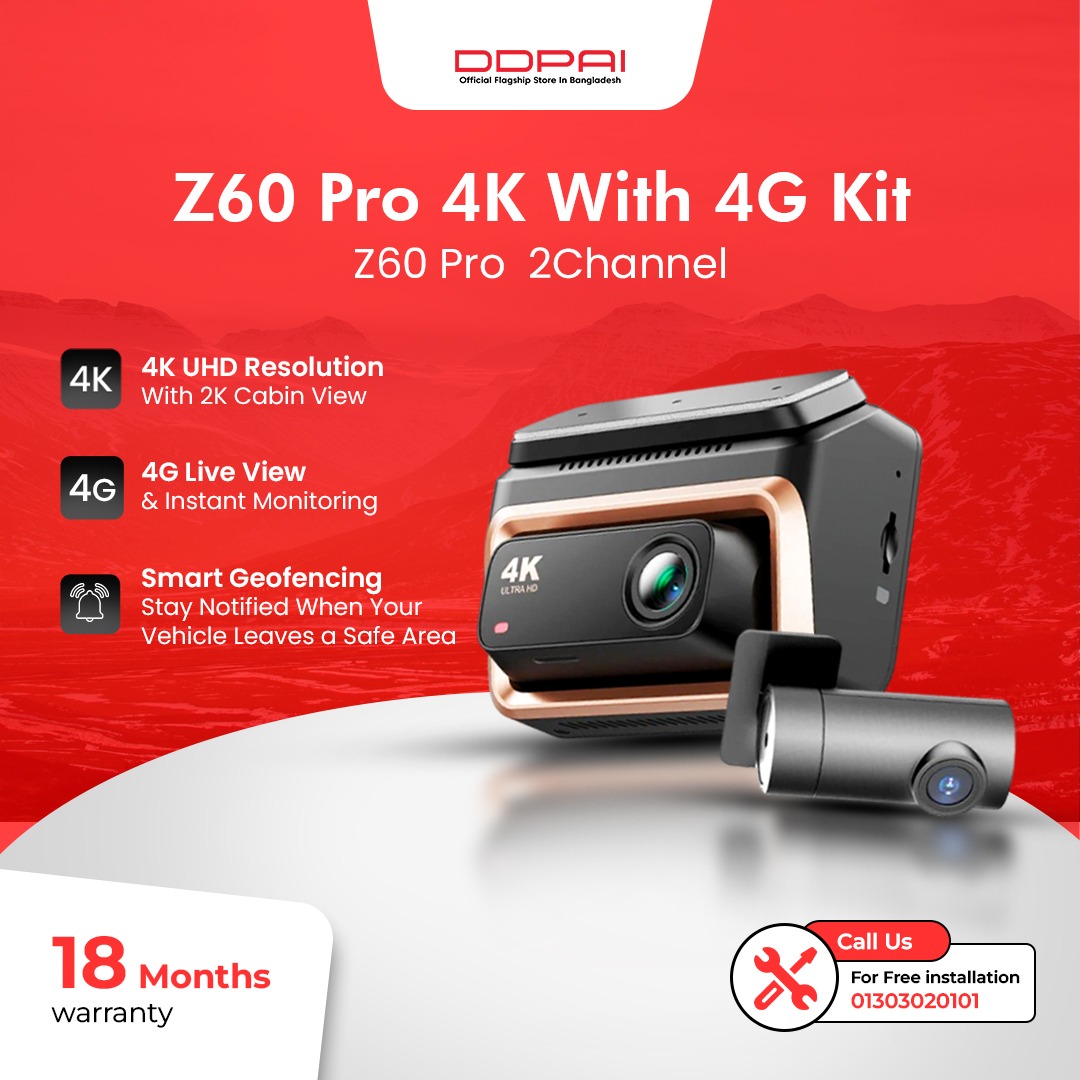 ❇️DDPAI Z60 Pro একটি ৪জি সাপোর্টেড ড্যাশ ক্যামেরা ।যেকোন যায়গা থেকে গাড়ি চলন্ত কিংবা বন্ধ থাকা অবস্থায় রিয়েল টাইম লাইভ ভিডিও দেখা যাবে আনলিমিটেড । যেহেতু আপাতত ম্যাসে কোন সাবক্রিপশন ফি নেই DDPAI কোম্পানি পরিবর্তন অথবা ফি নির্ধারণ করার অধিকার সংরক্ষণ করবে ( ৪জি হার্ডওয়ার কিট আলাদা ভাবে কিনতে হবে ) । ❇️ গাড়ি চলন্ত অবস্থায় যেকোন যায়গা থেকে গাড়ির লাইভ লোকেশন দেখা যাবে, গাড়ি চলছে কিনা কিংবা বন্ধ আছে এপ্সের মাধ্যমে দেখা যাবে । ❇️ গাড়ি চলন্ত কিংবা বন্ধ থাকা অবস্থায় ,গাড়ির লোকেশন দেখা যাবে, গাড়ি পার্কিং এ থাকা অবস্থায় বন্ধ /চলন্ত অবস্থায় কোন ধরনের collision হলে রেকোর্ড করে রাখবে যেমন অন্য গাড়ি ধাক্কা দেয়া , অথবা হঠাৎ ব্রেক ইত্যাদি ইমার্জেন্সি এগুলো ক্লাউডে আপলোড করে দিবে যেহেতু collision সেন্সরের মাধ্যমে ক্যাপচার করবে এক্ষত্রে ভিডিও ক্যাপচার/আপলোড Accuracy মাঝে মধ্যে মিস হতে পারে ‼️বিঃদ্রঃ- DDPAI ৪জি হার্ডওয়ার কিটের ফিচার্স গুলো এখনো বাংলাদেশ লোকাল অপারেটরের সাথে পরীক্ষাধীন অবস্থায় রয়েছে , গ্রামীনফোন ,রবি সিমের মাধ্যমে সকল সুবিধা ফিচার্স পরিক্ষামূলকভাবে সক্রিয় আছে । ভবিষ্যতে নেটওয়ার্ক ইস্যু ব্যতীত DDPAI বাংলাদেশ ৪ জি কিটের ৬ মাসের রিপ্লেসমেন্ট ( হার্ডওয়ার জনিত সমস্যার ক্ষেত্রে ) ওয়ারেন্টি প্রদান করছে । তাই ডিভাইসটি নিজ দায়িত্বে ক্রয় করার জন্য অনুরোধ করা হচ্ছে । (শর্ত প্রযোজ্য)