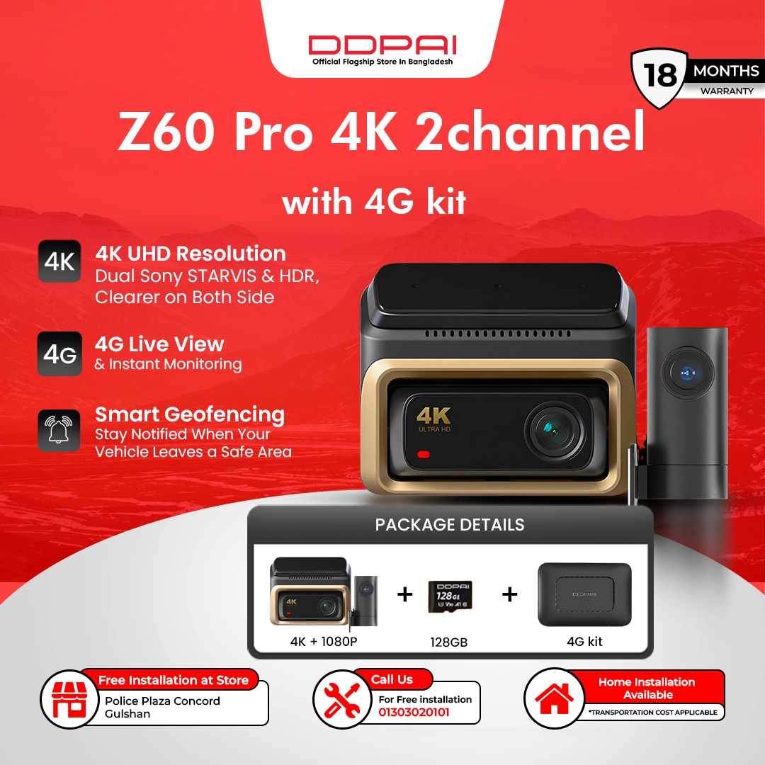 DDPAI Z60 Pro 4G Two Channel 4k+1080P &a 128GB Memory & 4G Parking Kit+ Transportation Cost For Home Installation -এই প্যাকেজে ২টি ক্যামেরা থাকবে যা দিয়ে গাড়ির সামনে এবং কেবিন ভিউ অথবা পেছনের ভিউ দেখা যাবে ।গাড়ি চলন্ত অবস্থায় সকল কিছু রেকোর্ড করবে,যেকোন যায়গা থেকে রিয়েল টাইম যেকোন ২টি ক্যামেরা লাইভ ভিডিও দেখা যাবে মাসিক কোন সাবক্রিপশন ফি ছাড়া (ddpai কোম্পানি পলিসি পরিবর্তনের উপর নির্ভরশীল ) , গাড়ি চলন্ত কিংবা বন্ধ থাকা অবস্থায় ,গাড়ির লোকেশন দেখা যাবে, গাড়ি পার্কিং এ থাকা অবস্থায় বন্ধ /চলন্ত অবস্থায় কোন ধরনের collision হলে রেকোর্ড করে রাখবে যেমন অন্য গাড়ি ধাক্কা দেয়া , অথবা হঠাৎ ব্রেক ইত্যাদি ইমার্জেন্সি এগুলো ক্লাউডে আপলোড করে দিবে যেহেতু collision সেন্সরের মাধ্যমে ক্যাপচার করবে এক্ষত্রে ভিডিও ক্যাপচার/আপলোড Accuracy মাঝে মধ্যে মিস হতে পারে , ৩২ জিবি মেমোরি থাকবে যা দিয়ে সকল রেকোর্ড গাড়িতে বসে এপ্স দিয়ে কানেক্ট করে মোবাইলে দেখা যাবে এবং ডাউনলোড করা যাবে ,এছাড়া ৫১২ পর্যন্ত মেমোরি সাপোর্ট করবে ,কোন তার কাটা ছাড়াই পাওয়ার গাড়ির সিগারেট লাইটার পোর্ট(চার্জার পোর্ট) অথবা ফিউজ বক্স থেকে যাবে,ব্যাটারি প্রোটেকশন দেয়া আছে সুতরাং ব্যাটারি বসে যাবে না ,৬০০ টাকা যাতায়াত খরচে ঢাকার যেকোন যায়গায়/বাসায় ইনষ্টলেশন করা যাবে অথবা আমাদের শপে এসে ফ্রী ইনষ্টল করা যাবে কিংবা দেশের যেকোন যায়গায় ফ্রী ডেলিভারি নেয়া যাবে , ক্যামেরা ১৮ ম্যাসের ওয়ারেন্টি +৪জি পার্কিং কিট ৬ মাসের (নেটোয়ার্ক ইস্যু ব্যতীত ) ‼️NB: Customers are advised to buy a genuine high-speed(U3 A2/A1) memory card from a well-known brand. ‼️128GB মেমোরি কার্ডে সর্বশেষ 8-10 ঘন্টার রেকোর্ড থাকবে , 256GB তে সর্বশেষ 16-20 ঘন্টার থাকবে (ব্যবহার অনুযায়ী কম বেশি হতে পারে) ।মেমোরি ফুল হয়ে গেলে মেমোরি খুলে ডিলেট করতে হবে না ,ক্যামেরা লুপিং মেথডে রেকোর্ড করবে অর্থাৎ প্রথম দিকের গুলো ডিলেট করে নতুন সময়ের ভিডিও রেকোর্ড করবে মাঝখানে ৮ থেকে ২৪ ঘন্টার রেকোর্ড থেকে যাবে মেমোরি কার্ডের ক্যাপাসিটি অনুযায়ী । 📌 DDPAI Z60 Pro দিনের এবং রাতের ভিডীও ফুটেজ Update Soon 📌চাইলে গাড়ির ভিতরেও লাগানো যাবেঃ  Update Soon 📌নতুন গাড়িতে ক্যামেরা ইনষ্টলেশন,Apps কনফিগারেশনের ভিডিওঃ  Update Soon 📌রেগুলার পার্কিং কিট এবং ৪জি পার্কিং কিট সম্পর্কে বিস্তারিত জানতেঃ  Update Soon 📢 আমাদের ধানমন্ডি ষ্টোর ঠিকানায় এসে ফ্রী ইনষ্টলেশন করা যাবে অথবা কুরিয়ারের মাধ্যমে দেশের যেকোন স্থানে ফ্রী ডেলিভারি নেয়া যাবে । ঢাকার মধ্যে যেকোন এলাকায় বাসায় গিয়ে ইনষ্টলেশনের জন্য ৬০০ টাকা টেকনিশিয়ান যাতায়াত খরচ প্রযোজ্য হবে তবে ইনষ্টলেশনের জন্য আলাদা কোন খরচ দিতে হবে না । ষ্টোর কিংবা হোম ইনষ্টলেশনের জন্য নুন্যতম একদিন আগে Schedule নিতে হবে । ঢাকার বাহীরের গ্রাহকরা যেকোন কার ডেকোরশনের শপ থেকে ইনষ্টলেশন করতে পারবেন আমরা